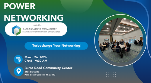 Join The Palm Beach North Chamber of Commerce's Ambassador Committee for our Power Networking event, the ultimate gathering for professionals and entrepreneurs seeking to unlock the true potential of networking. This high-energy event is designed to provide a dynamic platform for individuals from diverse industries to connect, collaborate, and accelerate their professional growth.