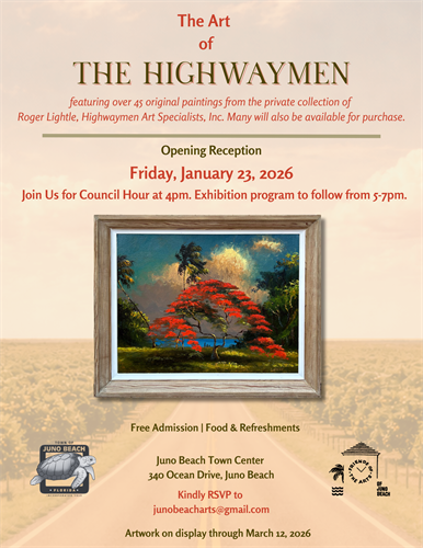 The public is invited to the opening night reception which will be held at the Juno Beach Town Center, located at 340 Ocean Drive in Juno Beach, on Friday, January 23rd. Meet Juno Beach Town Council members during Council Hour from 4-5pm and then the art program will follow from 5-7pm.